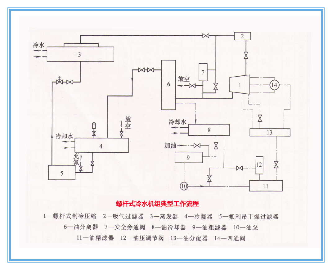 螺桿式冷水機(jī)組的典型工作流程如下圖所示,它由制冷系統(tǒng)和潤(rùn)滑油系統(tǒng)兩部分組成。制冷系統(tǒng)的工作流程為:制冷劑在蒸發(fā)器中汽化,所產(chǎn)生的蒸氣經(jīng)過吸氣過濾器進(jìn)入壓縮機(jī)。制冷劑在壓縮機(jī)中被壓縮成高壓氣體,同時(shí)潤(rùn)滑油噴入壓縮機(jī)中與制冷劑一起被壓縮,壓縮后潤(rùn)滑油和制冷劑進(jìn)入油分離器,其中無油的制冷劑進(jìn)入冷凝器,在冷凝器中變?yōu)轱柡鸵后w后進(jìn)入過冷器過冷,變?yōu)檫^冷液體,然后流向節(jié)流閥,經(jīng)過節(jié)流降壓降溫后進(jìn)入蒸發(fā)器。潤(rùn)滑油系統(tǒng)由油分離器、油冷卻器、油過濾器、油泵、油壓調(diào)節(jié)閥、油分配器和四通閥組成,其工作流程為:從油分離器分離出來的潤(rùn)滑油,為避免油溫過高降低潤(rùn)滑性,先經(jīng)過油冷卻器進(jìn)行冷卻,然后在沒泵作用下經(jīng)過油粗濾器、油精濾器進(jìn)入油分配器,接著分成兩路進(jìn)入壓縮同。一路去潤(rùn)滑軸承并起冷卻作用,另一路去壓縮機(jī)噴射。